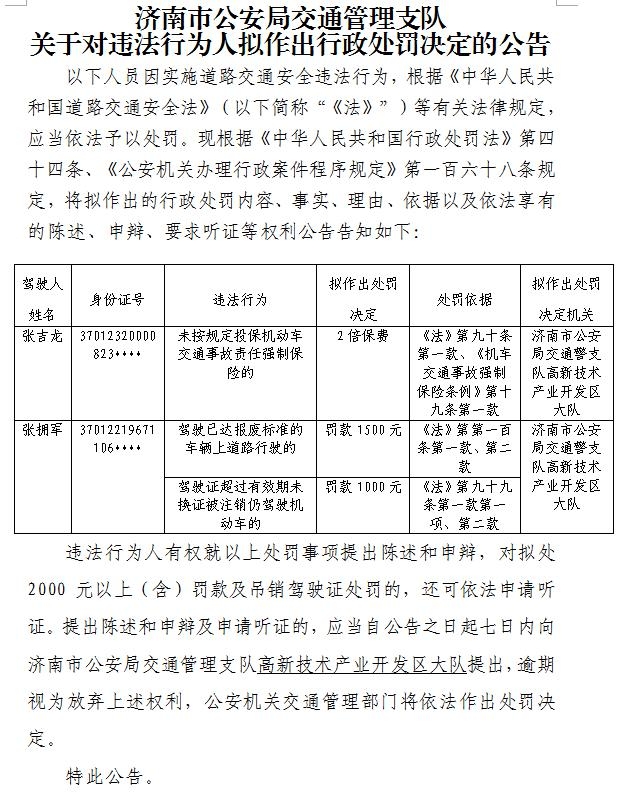 济南市公安局交通管理支队关于对违法行为人拟作出行政处罚决定的公告