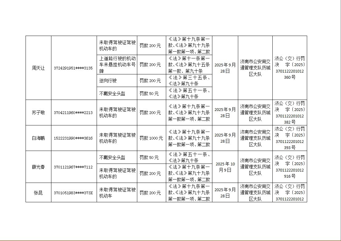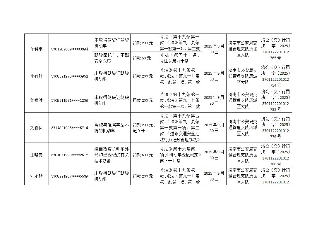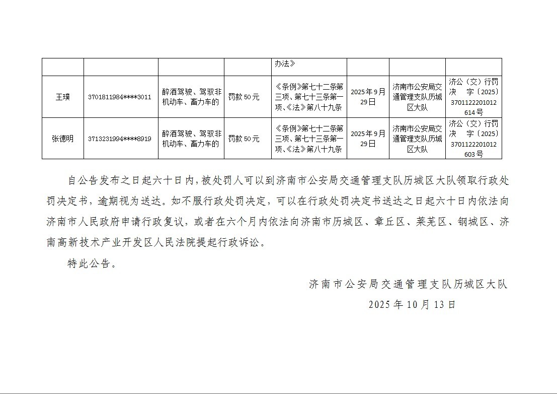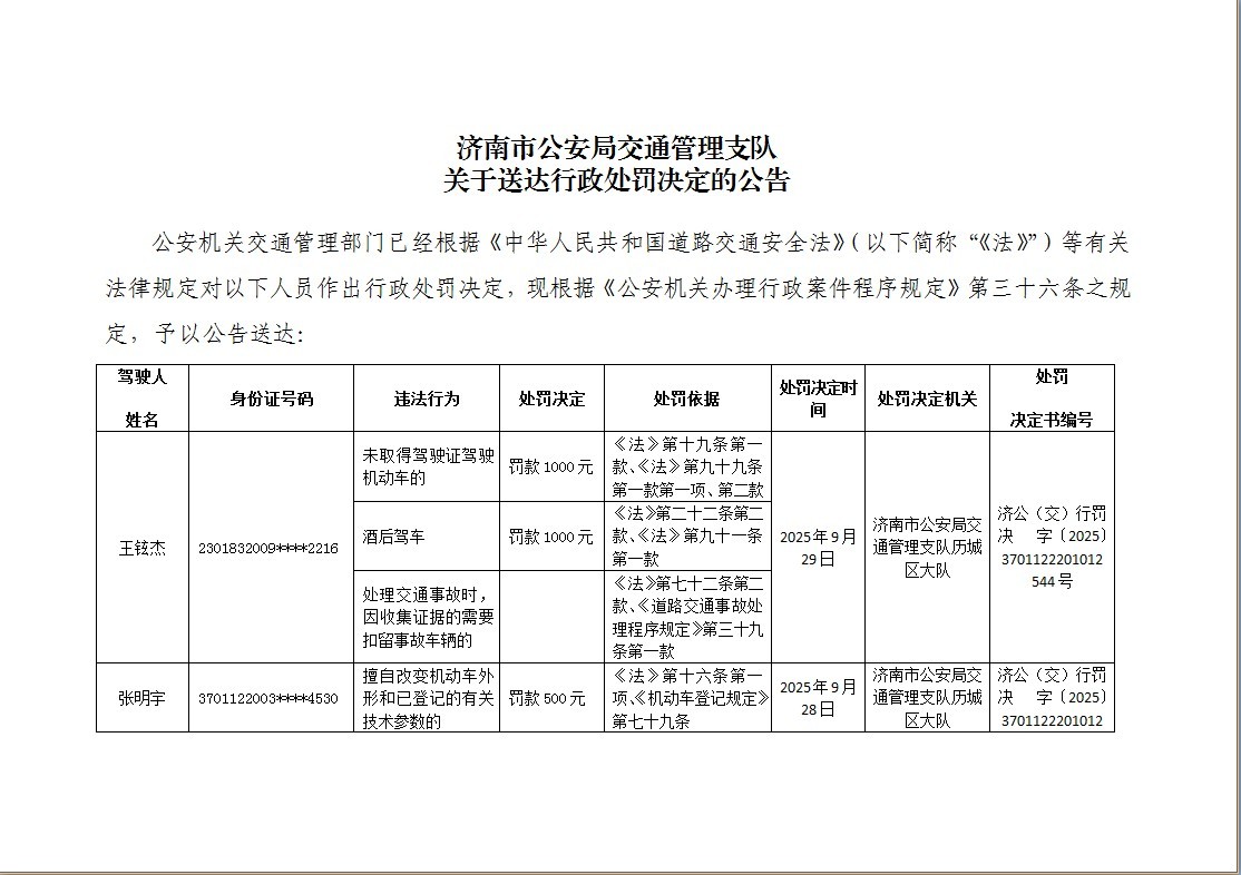 济南市公安局交通管理支队关于送达行政处罚决定的公告
