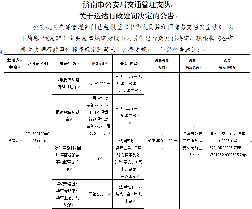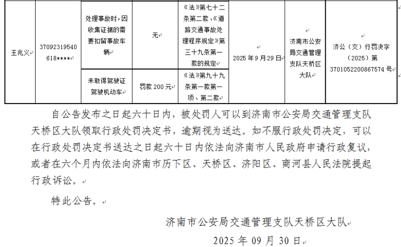 济南市公安局交通管理支队关于送达行政处罚决定的公告