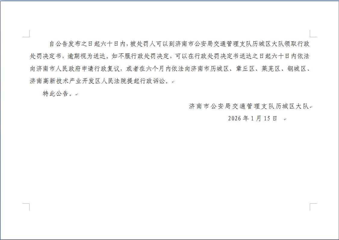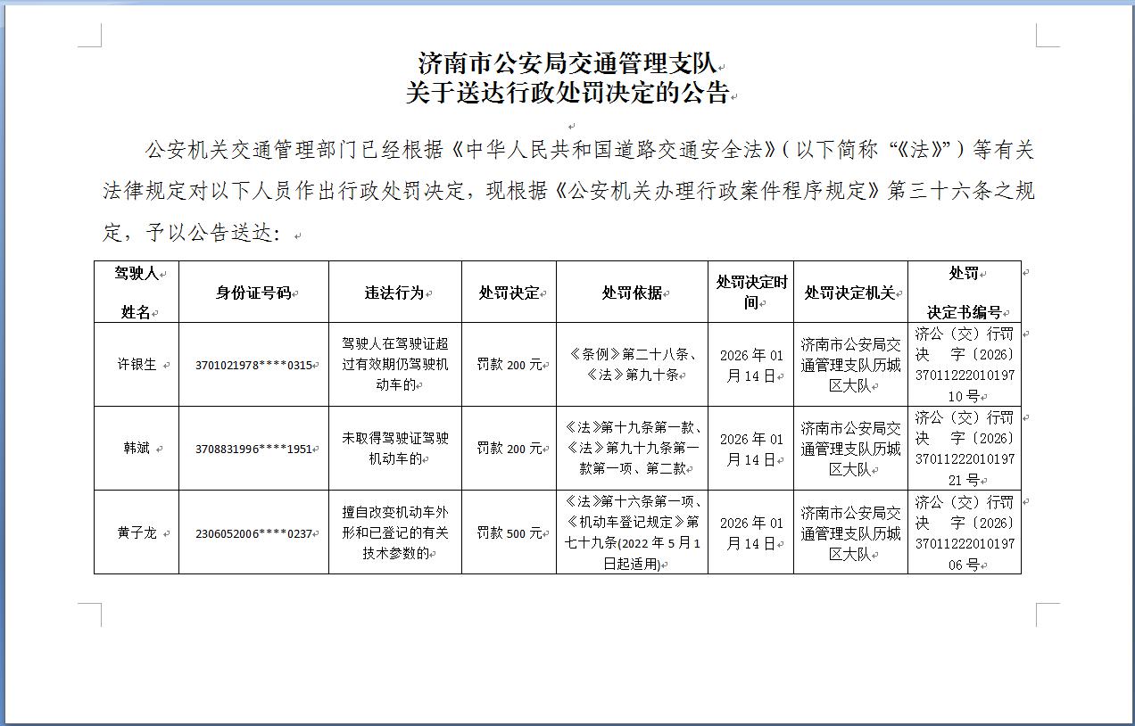 济南市公安局交通管理支队关于送达行政处罚决定的公告