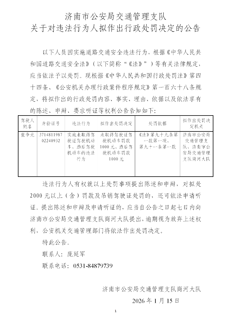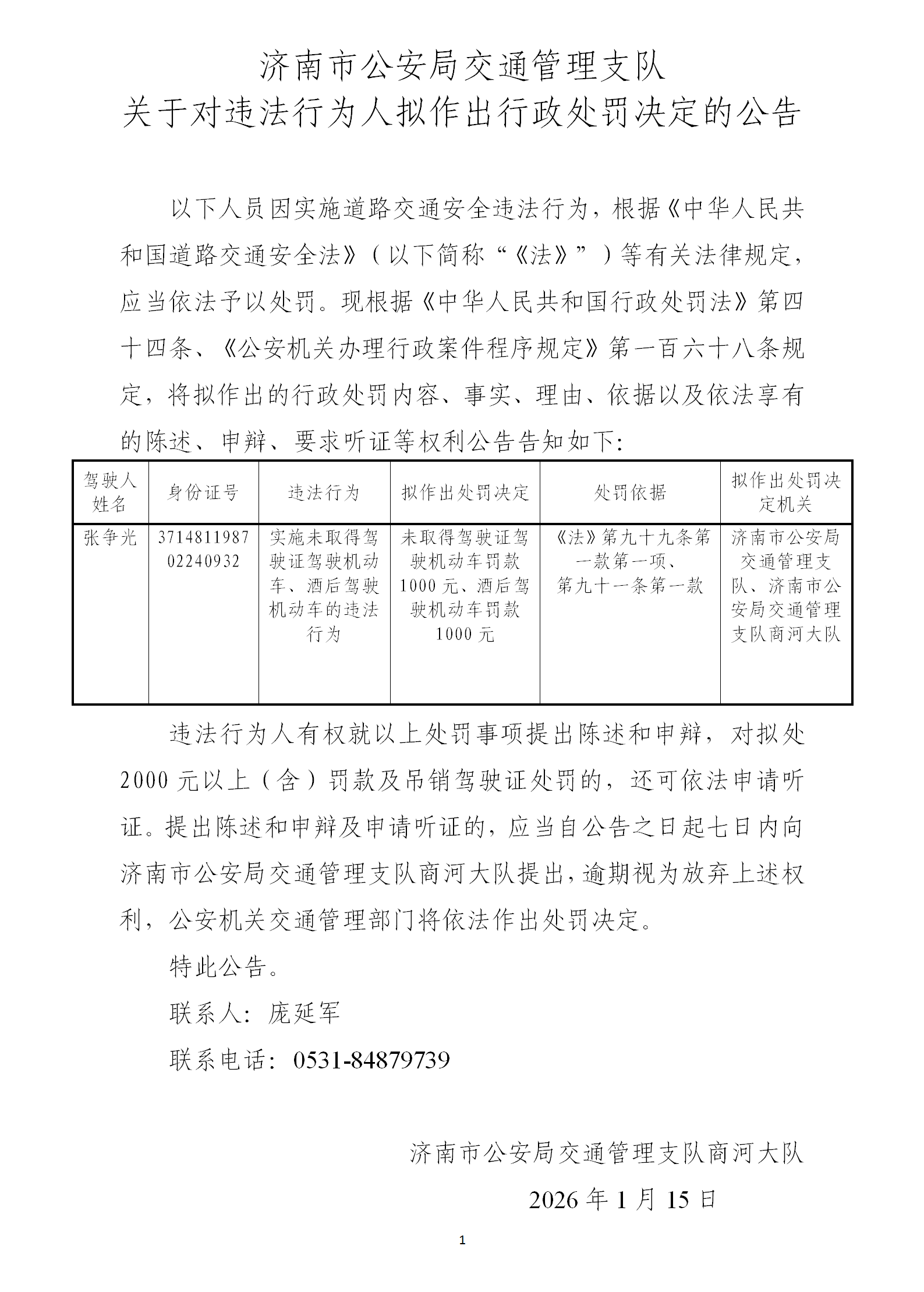 济南市公安局交通管理支队关于对违法行为人拟作出行政处罚决定的公告