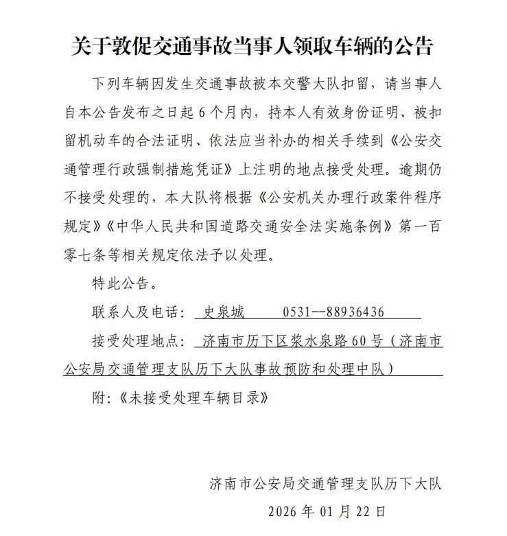 关于敦促交通事故当事人领取车辆的公告