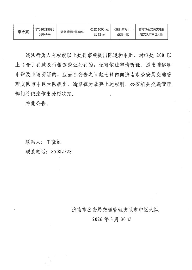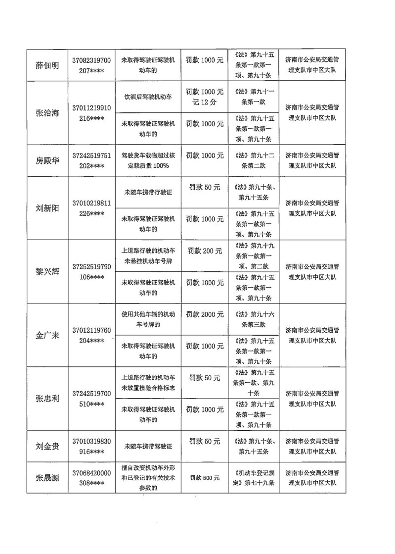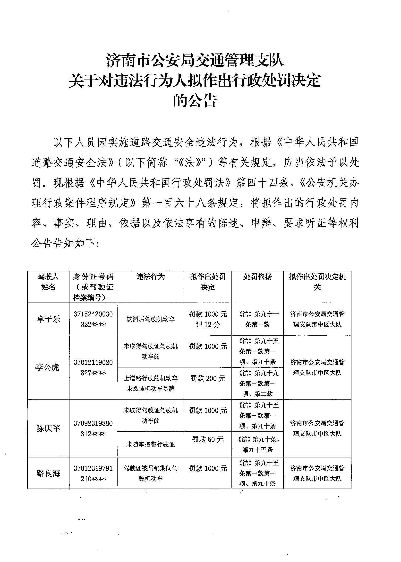 济南市公安局交通管理支队关于对违法行为人拟作出行政处罚决定的公告