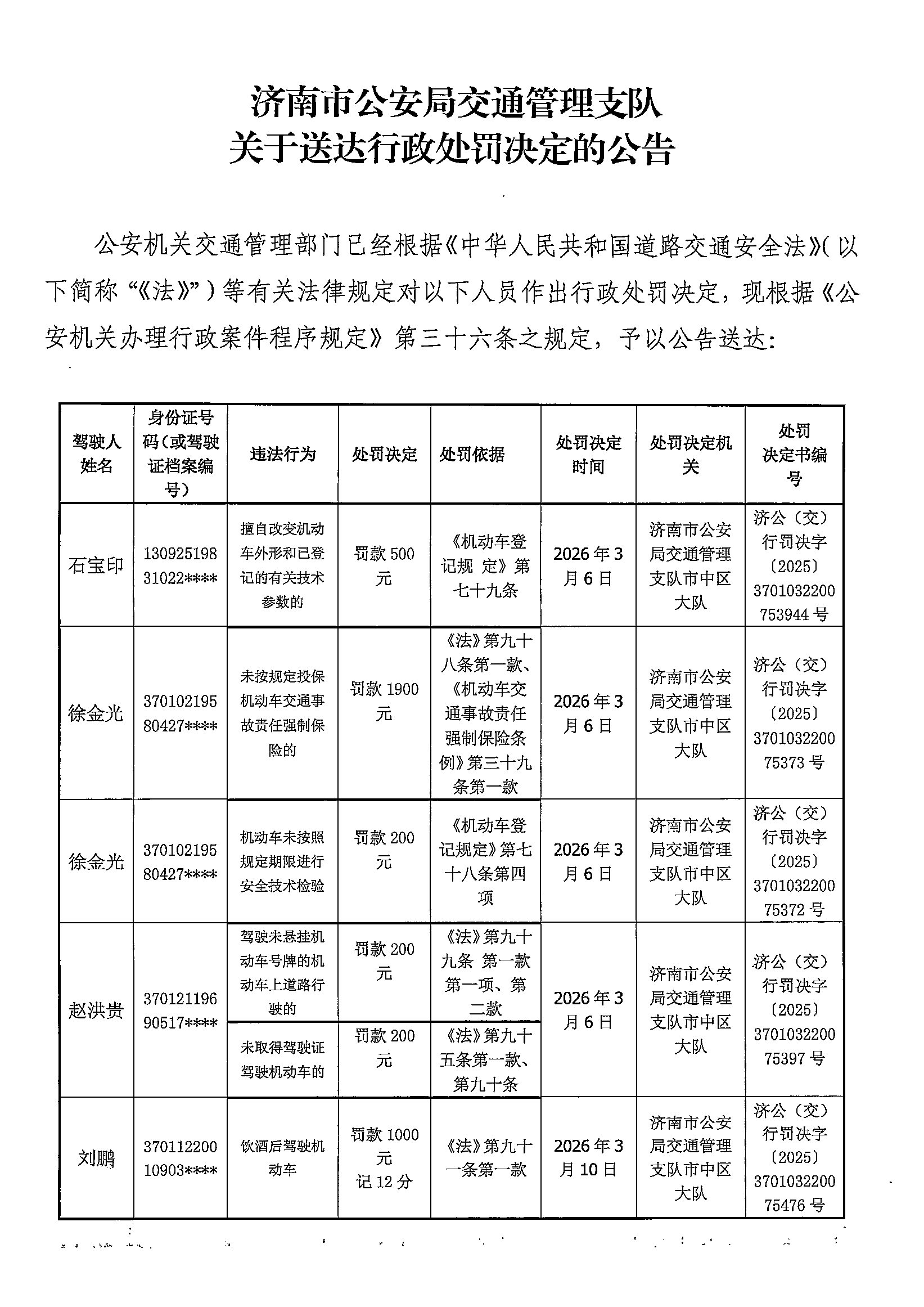 济南市公安局交通管理支队关于送达行政处罚决定的公告