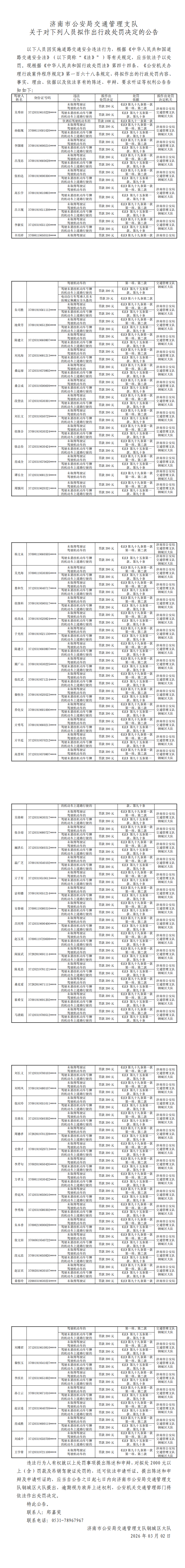 济南市公安局交通管理支队关于对下列人员拟作出行政处罚决定的公告
