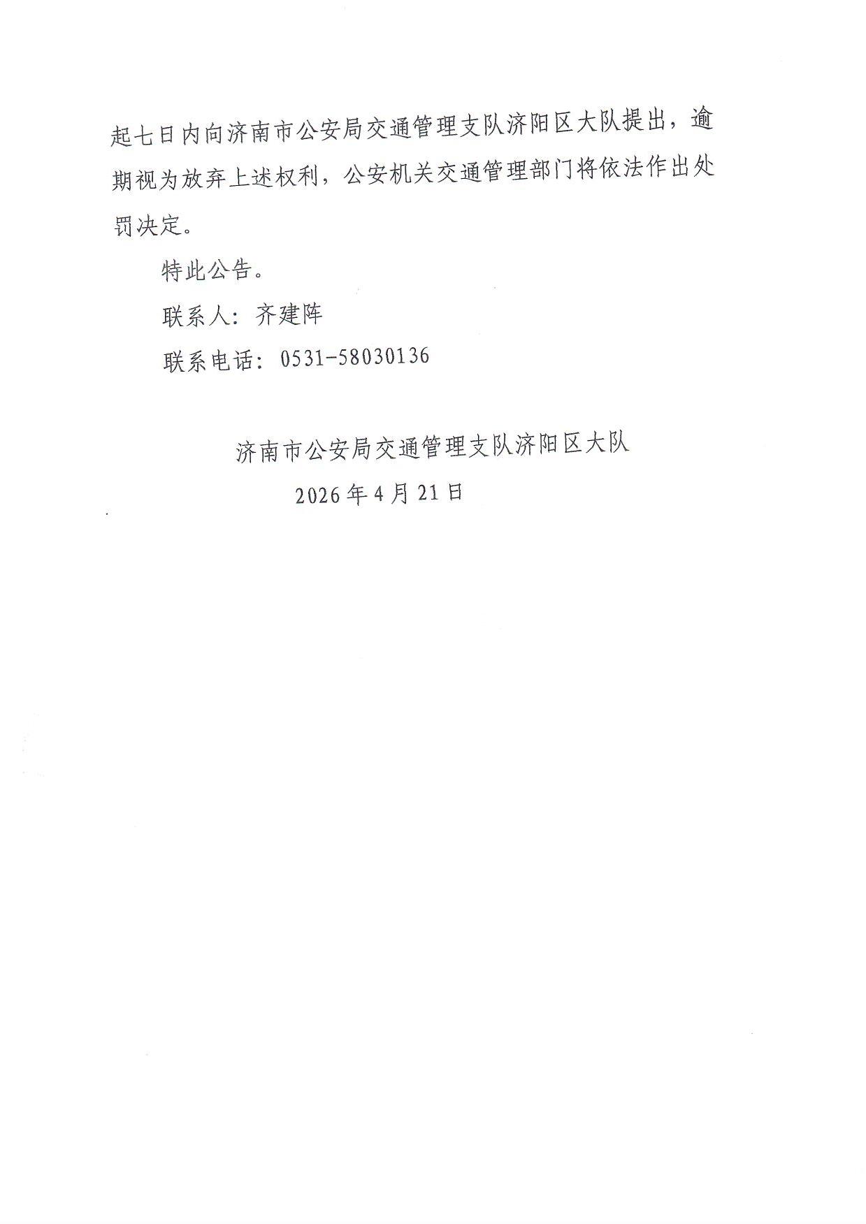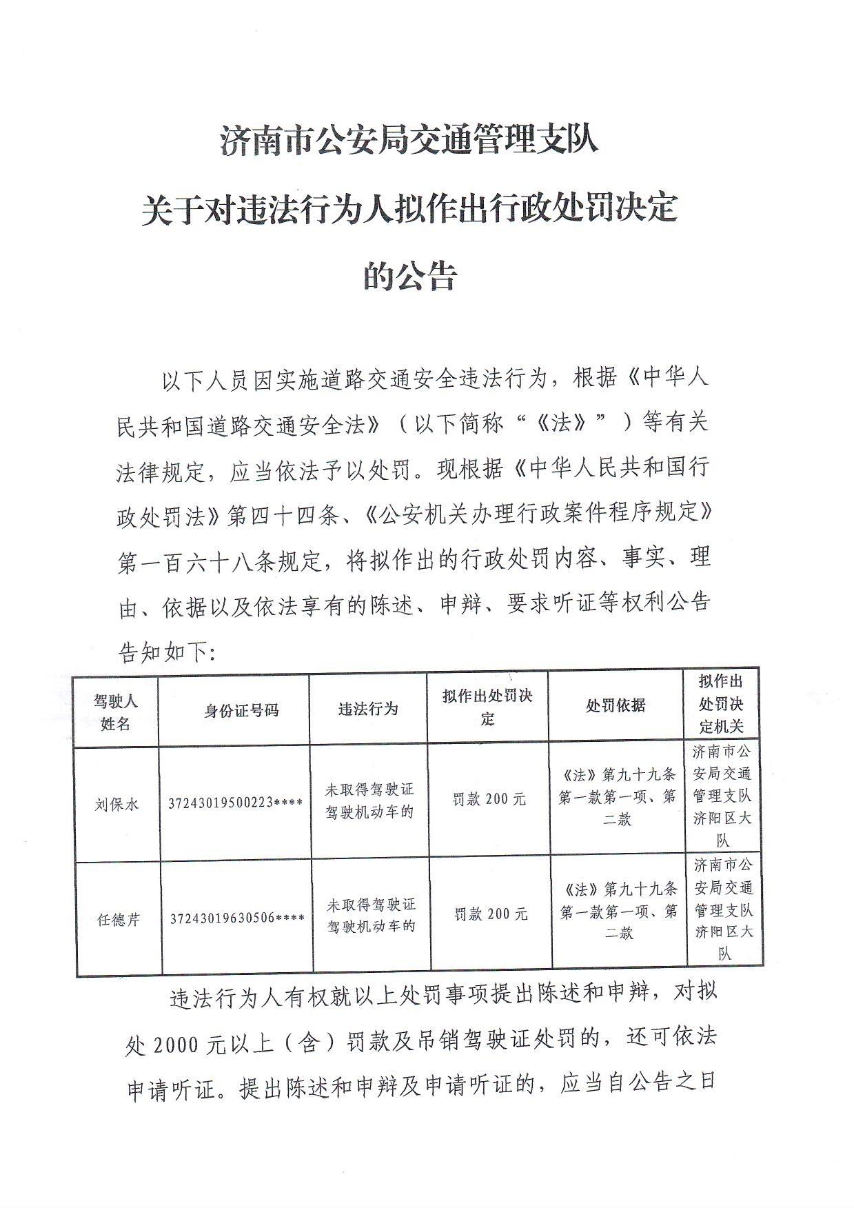 济南市公安局交通管理支队关于对违法行为人拟作出行政处罚决定的公告