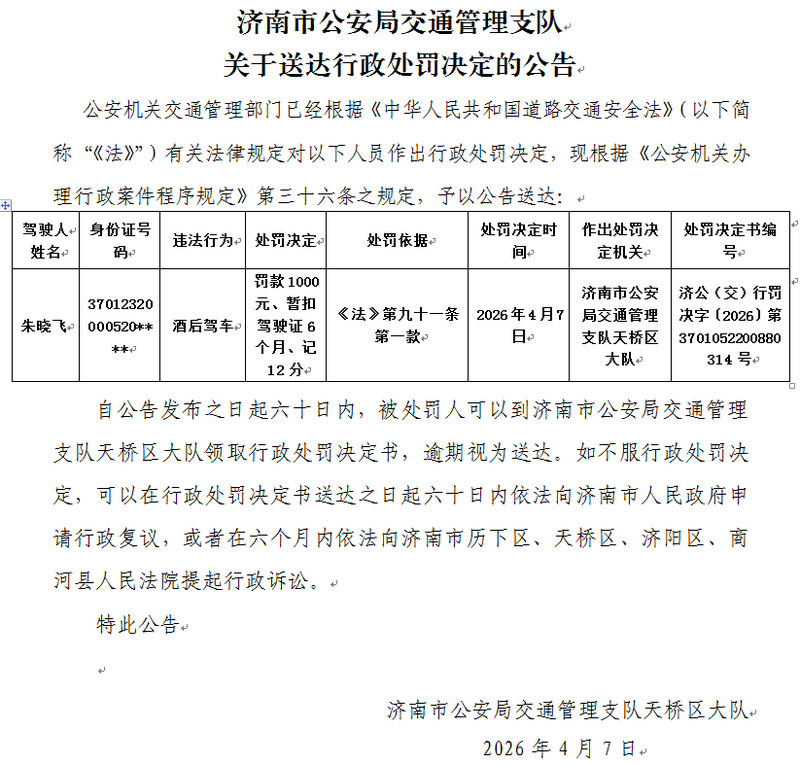 济南市公安局交通管理支队关于送达行政处罚决定的公告