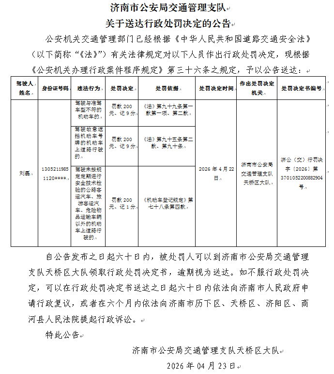 济南市公安局交通管理支队关于送达行政处罚决定的公告
