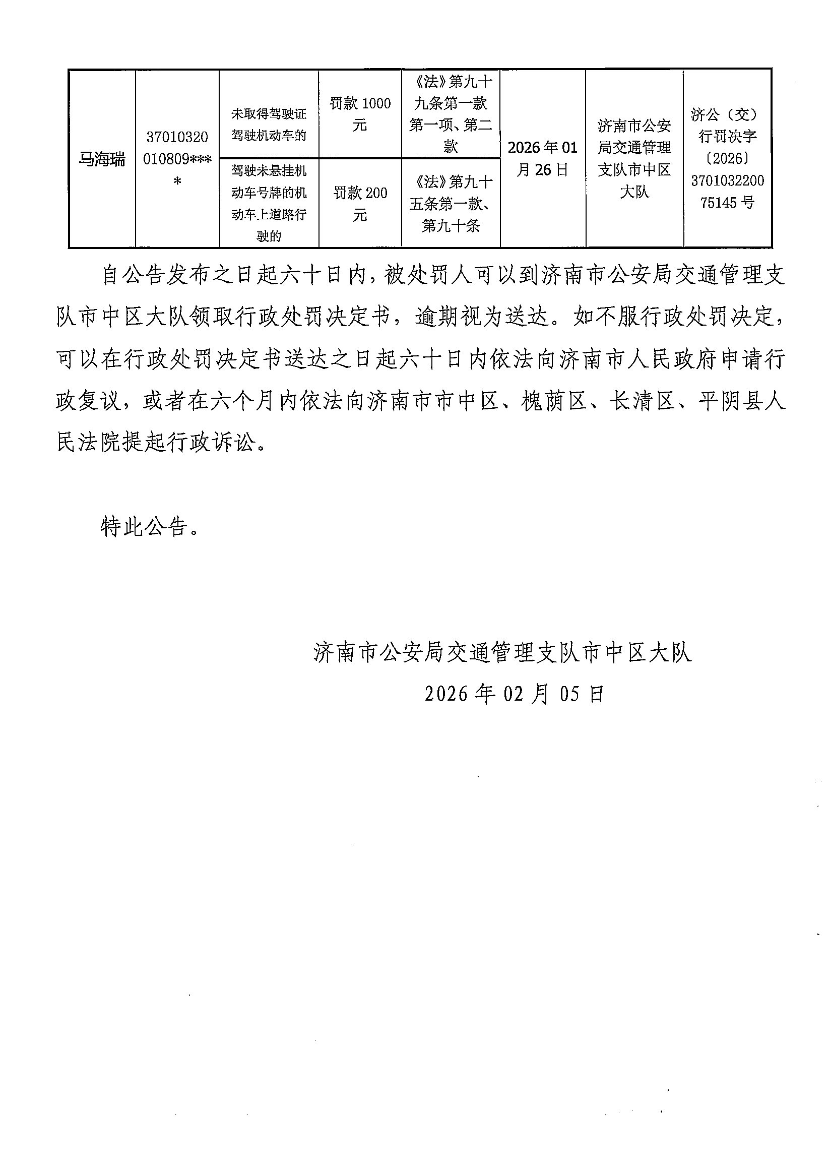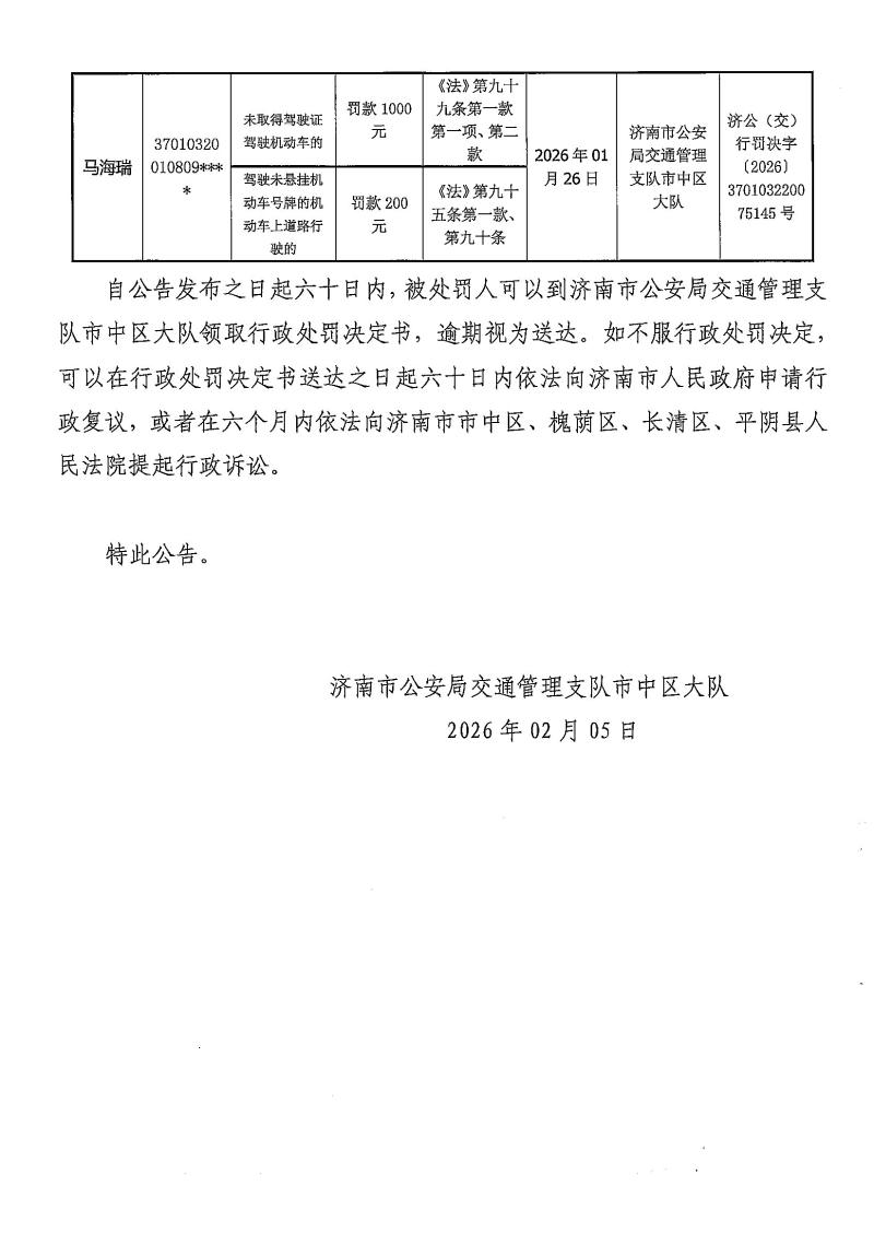 济南市公安局交通管理支队关于送达行政处罚决定的公告