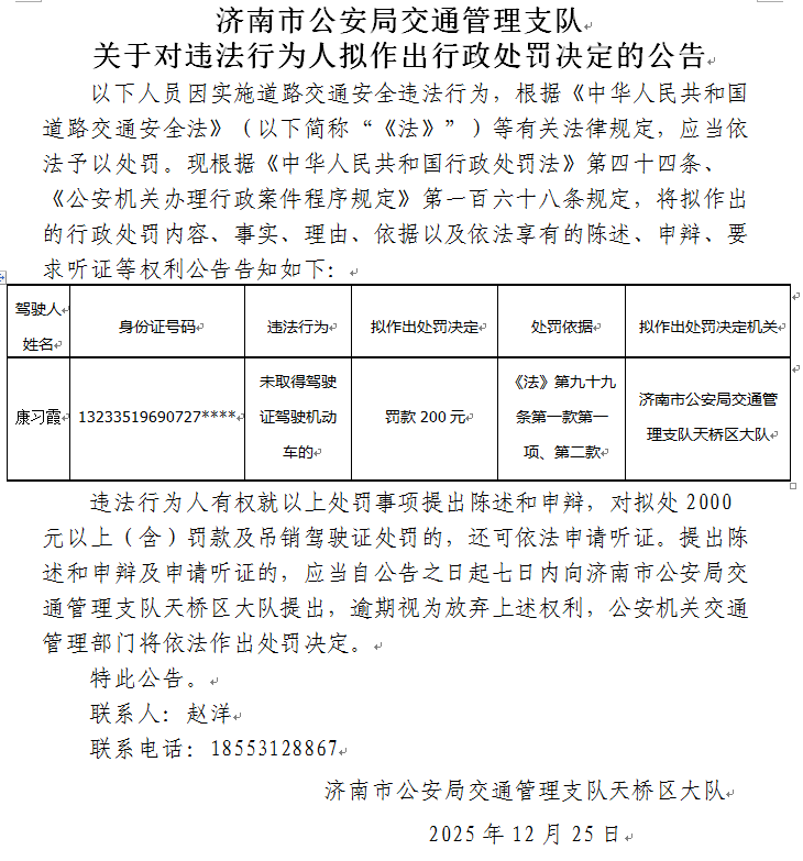 济南市公安局交通管理支队关于对违法行为人拟作出行政处罚决定的公告