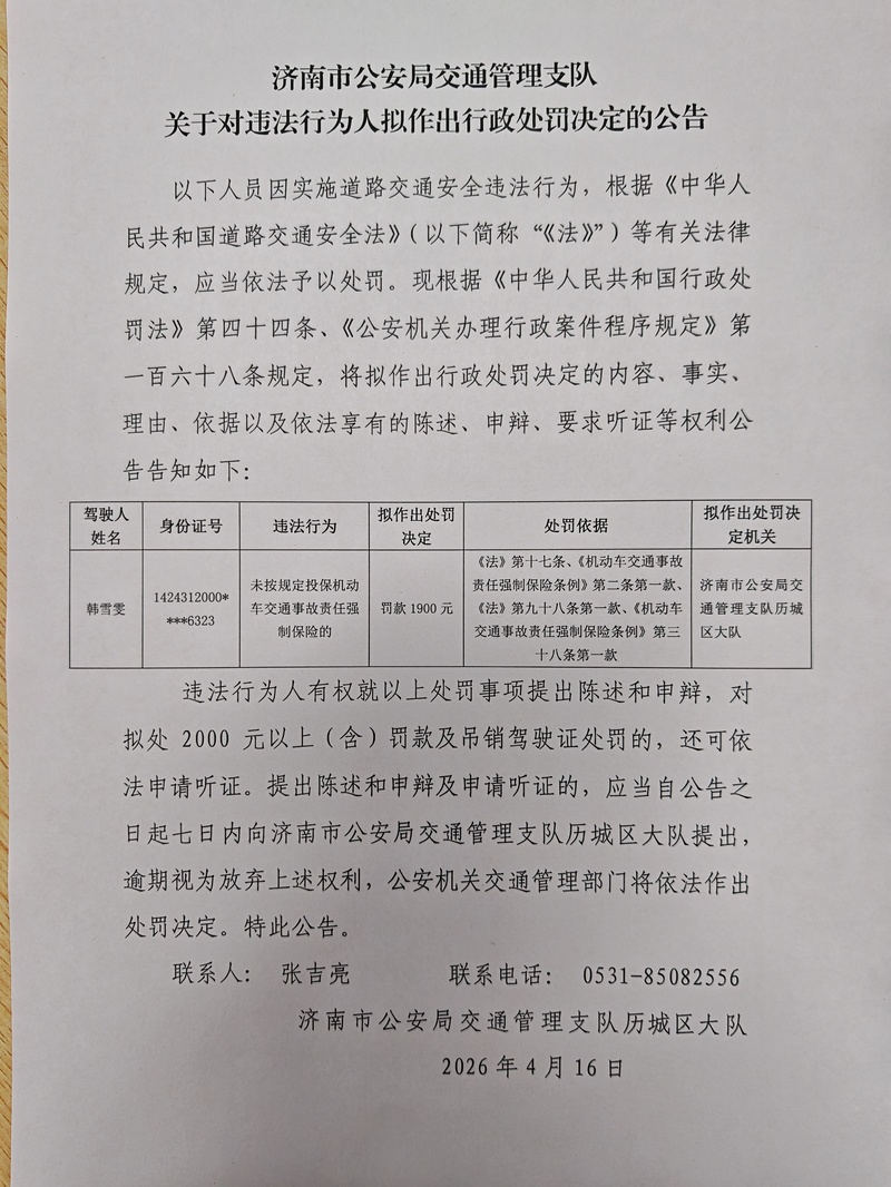 济南市公安局交通管理支队关于对违法行为人拟作出行政处罚决定的公告