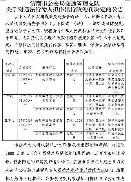 济南市公安局交通管理支队关于对违法行为人拟作出行政处罚决定的公告