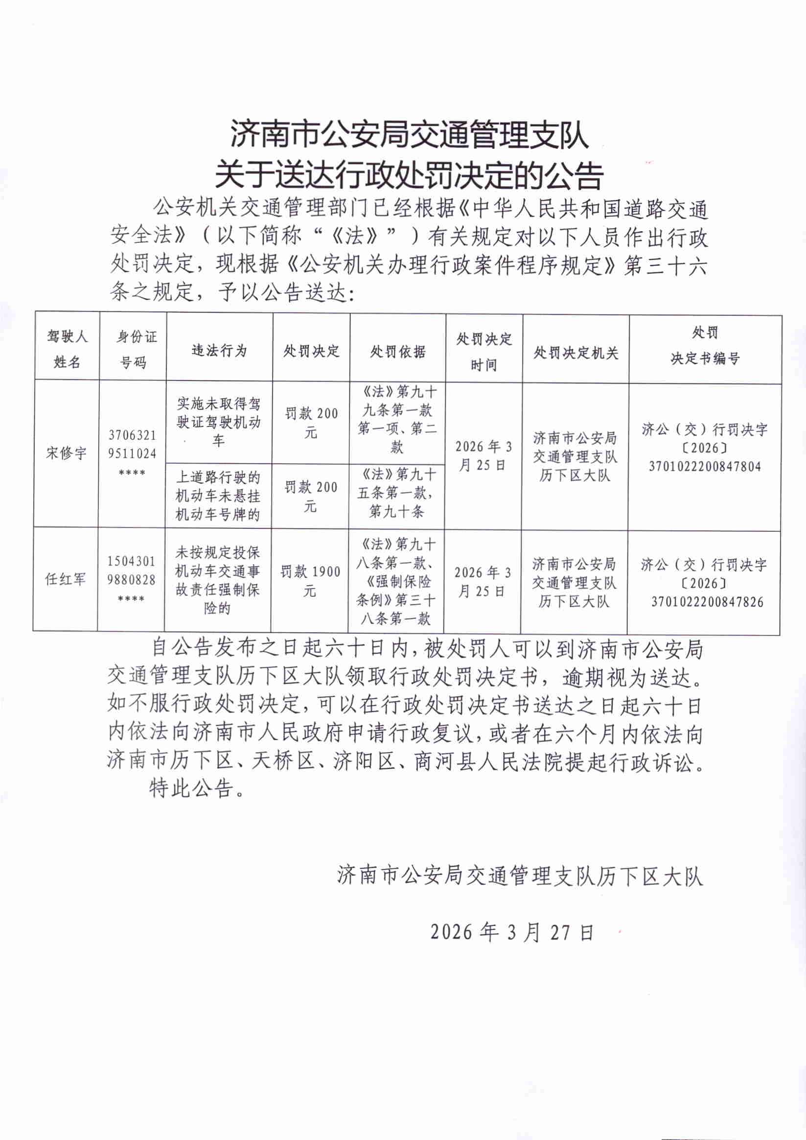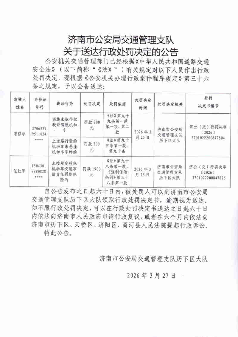 济南市公安局交通管理支队关于送达行政处罚决定的公告
