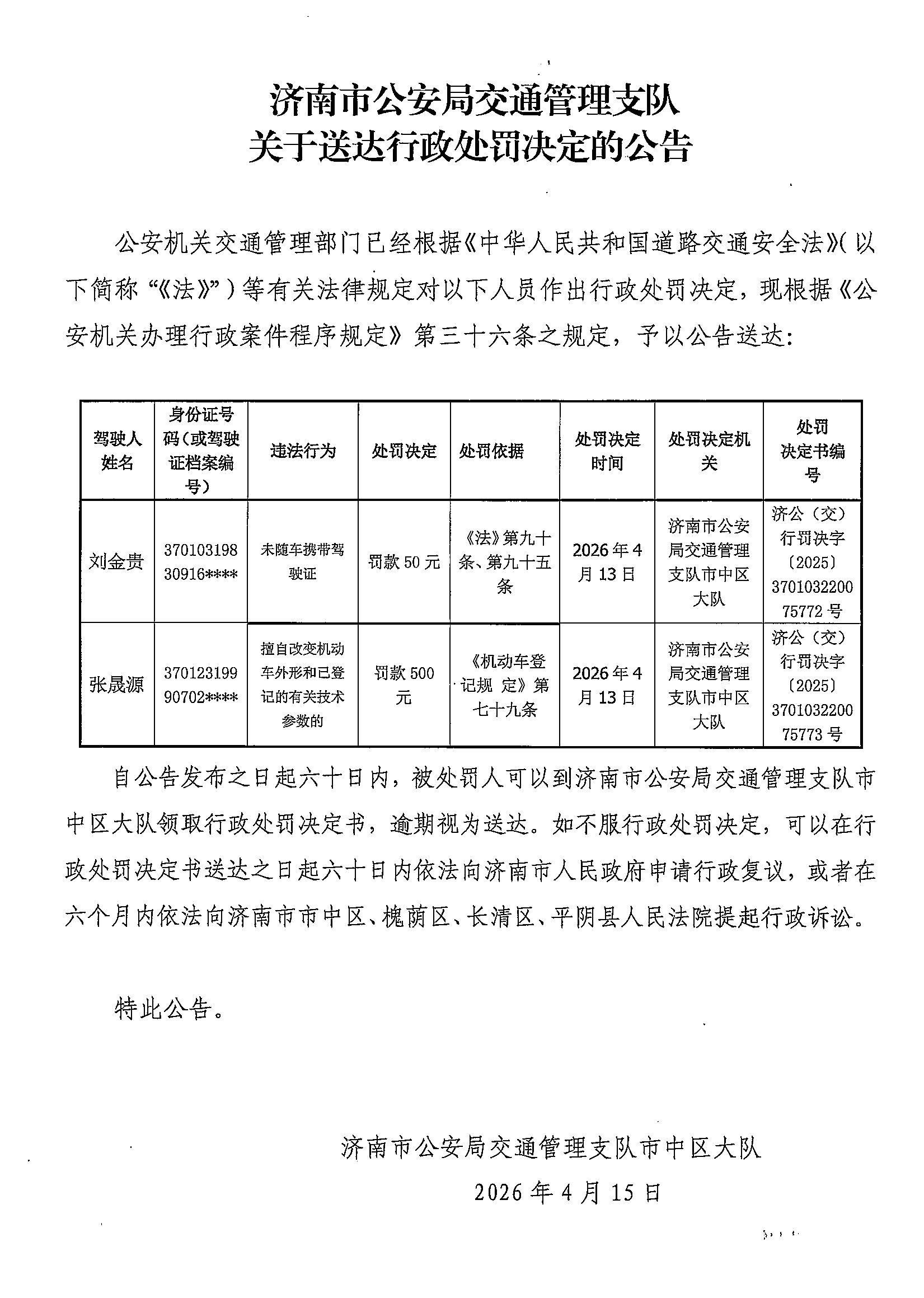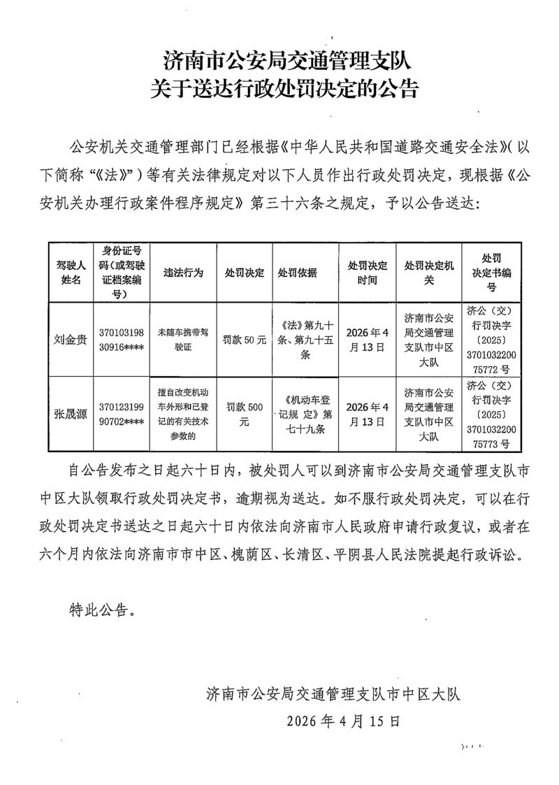 济南市公安局交通管理支队关于送达行政处罚决定的公告