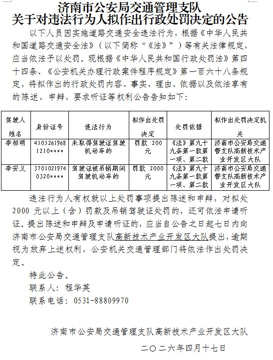 济南市公安局交通管理支队关于对违法行为人拟作出行政处罚决定的公告