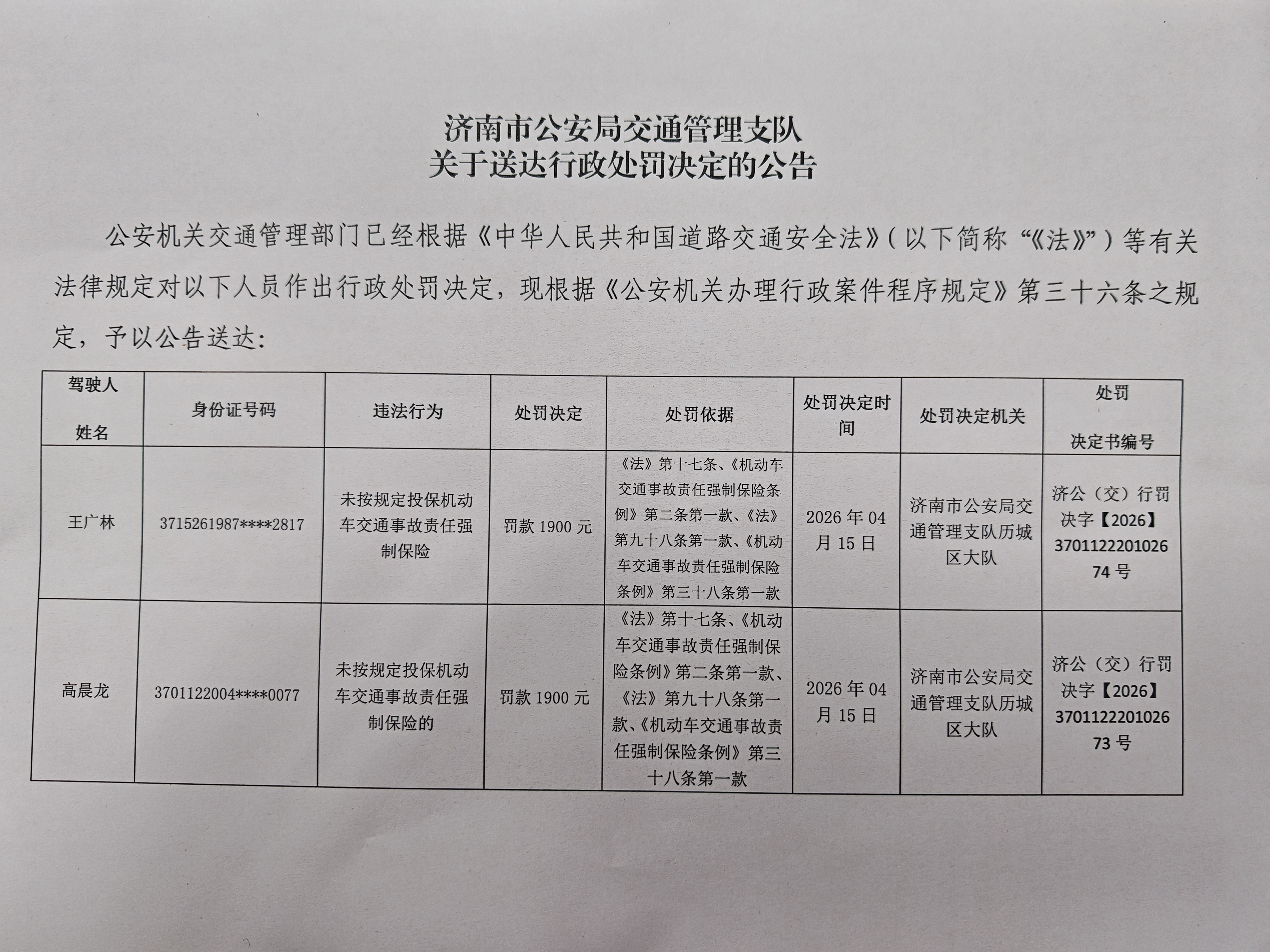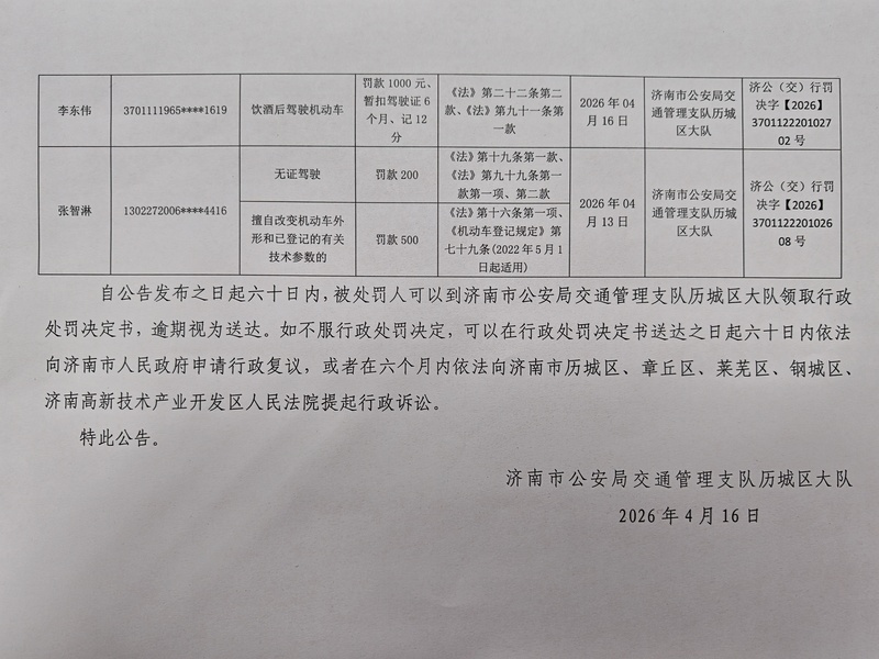 济南市公安局交通管理支队关于送达行政处罚决定的公告